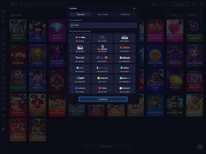 - Banking: Bank Wire Transfer, InstaDebit,Interac,Maestro, MasterCard Credit, Skrill, NETELLER, Paysafecard, Visa Credit,Visa Debit,Yandex / Yoo Money,Neosurf,Payz,iDebit, Bitcoin, Zimpler, EcoVoucher, AstroPay Card, Flexepin, Litecoin, Ethereum, Bitcoin Cash, Dogecoin, MuchBetter, Ripple, Tether, Rapid Transfer, TRON, MasterCard Debit, MiFinity, STICPAY,CashtoCode,eZeeWallet, Cardano, Piastrix,Vega Wallet,Binance+33 moreShow less...
