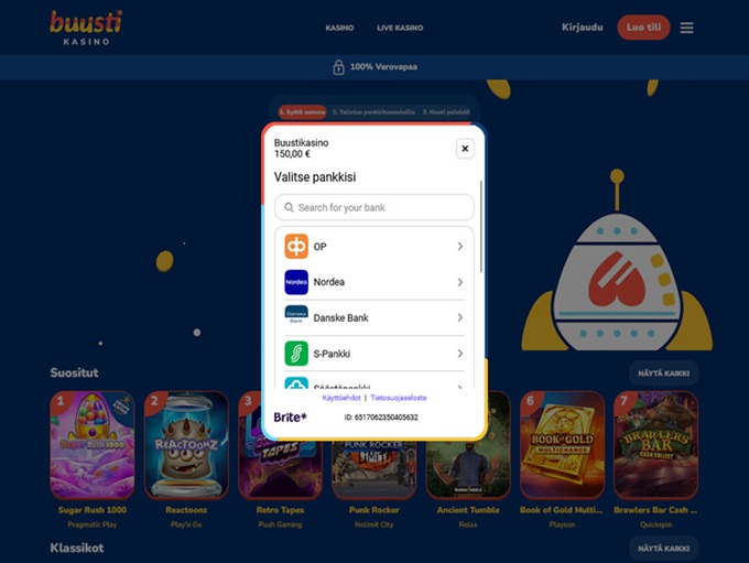 Tämä Pay N Play nettikasino toimii ilman rekisteröitymistä, kun käytössä on suomalaiset verkkopankkitunnukset. Talletukset, kotiutukset sekä pelitilille kirjautuminen tapahtuu Brite pikapankkipalvelun avulla, mikä takaa turvalliset ja reaaliaikaiset siirrot. Brite tukee suosituimpia suomalaisia pankkeja kuten Säästöpankki, POP, Oma Säästöpankki, Nordea, Danske Bank, S-Pankki, Aktia, Ålandsbanken sekä OP.