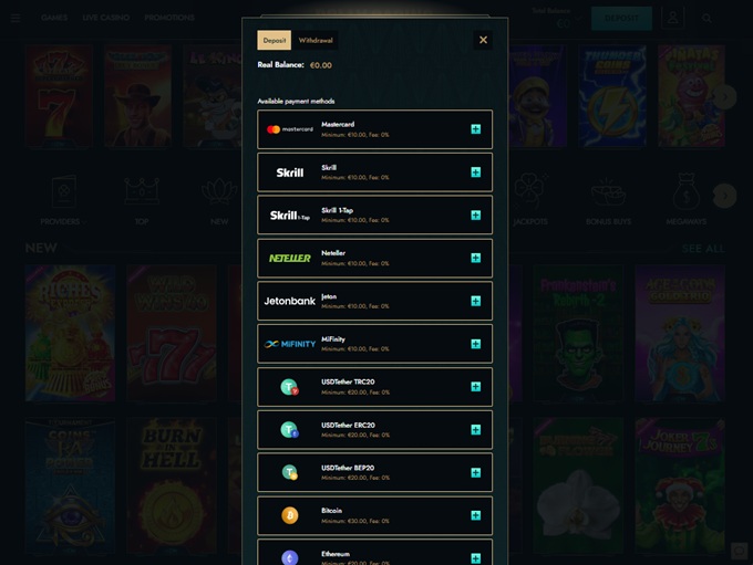 Maksuvaihtoehdot vaihtelevat pelaajan maan mukaan ja tässä tapauksessa suomalaisille tarjoutuu monipuolinen valikoima erilaisia talletus- ja kotiutustapoja. Vaihtoehtoja ovat korttimaksut, nettilompakot kuten Skrill, paysafecard ja muut prepaidmaksut, Zimpler pikapankki ja mobiilimaksut suomalaisella Siru Mobilella. Kryptovaluutoista sallittuja ovat Ethereum, Bitcoin, Tether, Litecoin ja Bitcoin Cash.
