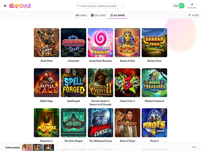 Dreamz nettikasino tarjoaa laajan valikoiman kolikkopelejä sekä jackpot pelejä. Voit pelata tällä kasinolla yhtiä tunnetuimmista peleistä, kuten Bonanza, Starburst, Aloha, Extra Chilli sekä Book of Dead. Valikoima tarjoaa myös jackpot pelejä kuten Hall of Gods, Mega Moolah sekä Divine Fortune.