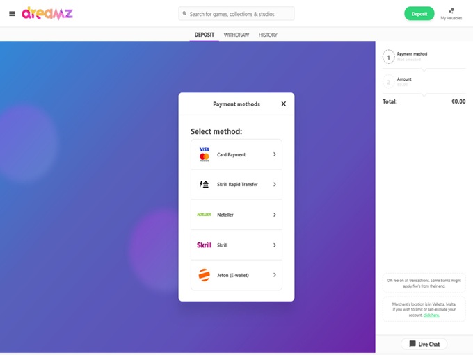 Rahansiirrot Dreamz casinolle ovat reaaliajassa ja kotiutus kestää yleensä maksimissaan 5 minuuttia verkkopankkiin ja muutamassa minuutissa nettilompakkoon.
