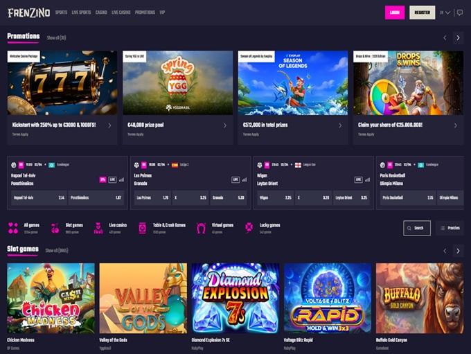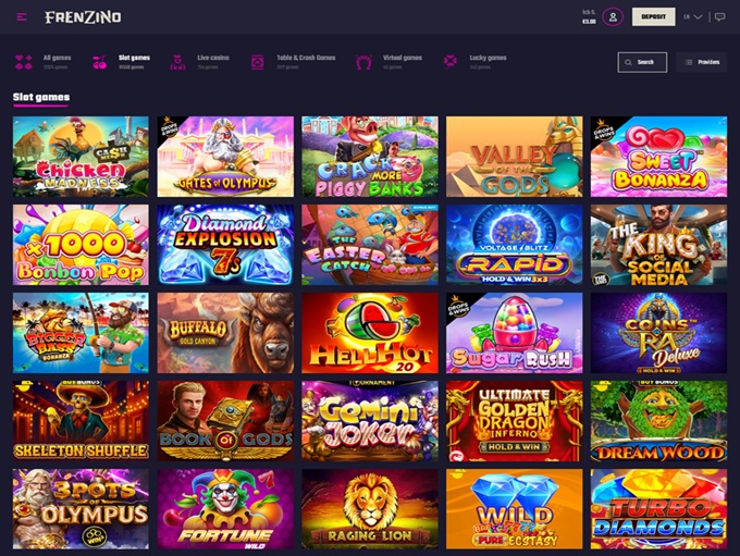 Frenzino Casinon pelivalikoima on yksi sivuston suurimmista vahvuuksista. Tarjolla on yli 16 700 rahapeliä, joihin kuuluu kolikkopelit, livekasino, pöytäpelit, crash-pelit, virtuaaliurheilu sekä nopeat onnenpelit. Monet peleistä ovat kokeiltavissa demotilassa, ja selkeä hakutoiminto sekä mobiiliystävällinen pelialusta helpottavat suosikkipelien löytämistä.