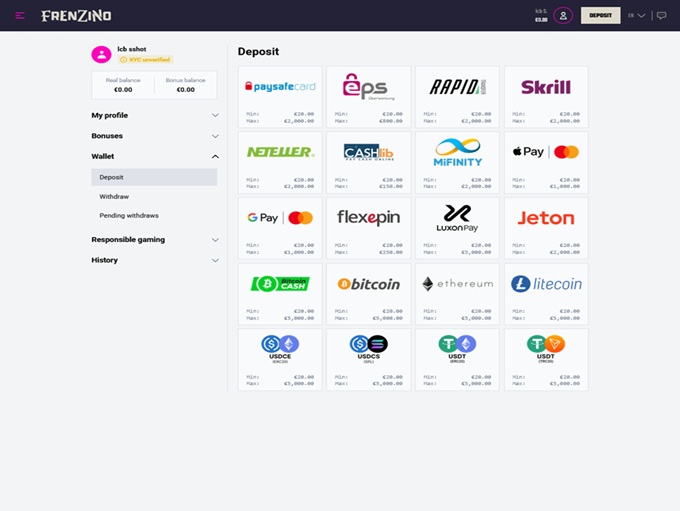 Frenzino Casino toimii Zimpler Pay N Play -periaatteella, joten pelaaminen onnistuu ilman rekisteröitymistä suomalaisilla verkkopankkitunnuksilla esim. Nordean tai S-Pankin avulla. Tunnistautuminen tapahtuu automaattisesti talletuksen yhteydessä. Minimitalletus on 25 €, mikä vastaa useimpien pikakasinoiden tasoa, eikä muita maksutapoja ole suomalaisille tarjolla.
