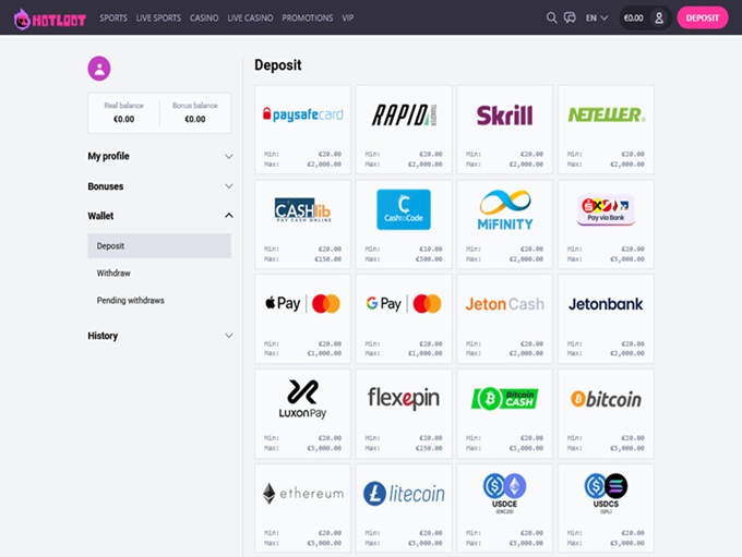 HotLoot Casinon maksutavat tarjoavat suomalaisille joustavuutta. Käytössä ovat sekä perinteinen rekisteröityminen että Zimpler Pay N Play, joten talletus onnistuu ilman rekisteröitymistä, mutta halutessaan voi käyttää myös nettilompakoita kuten Skrill ja Neteller, sekä prepaid-maksuja kuten Paysafecard.