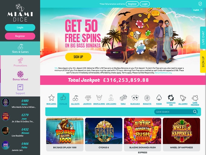 Miami dice casino on ulkoasultaan selkeä ja mielestämme hyvin rakennettu pelaajien mieltymyksiä kuunnellen. Sivusto toimii nopeasti ja vaivatta kaikilla laitteilla ja pelien vaihtaminen onnistuu helposti valikon tai haku-alueen avulla.