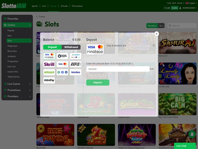 SlottoJam on varsin tuore, mutta kuitenkin perinteisellä mallilla toimiva nettikasino. Pelaamaan päästäkseen tulee rekisteröityä, joten pikapelaamista ei ole tiedossa. Tämä puolestaan johtaa siihen, että maksutavoilta odotetaan paljon. Tämän SlottoJam onkin tiedostanut ja tarjoaa useita erilaisia vaihtoehtoja rahansiirtojen eli talletuksien ja kotiutusten hoitamiseen. Minimitalletus on 20 euroa.