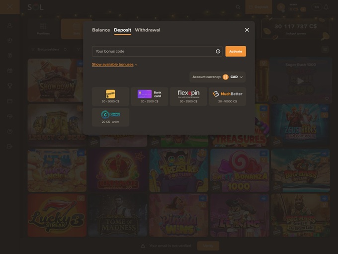 Sol Casinon maksumenetelmät pitävät sisällään nettilompakoita, korttimaksuja sekä kryptovaluutat litecoin, bitcoin sekä ethereumin. Koska kyseessä on curacaolainen netticasino, niin ei se kuulu verovapaisiin kasinoihin. Tästä syystä suomalaisille pelaajille tämä toimii hyvin kryptokasinona, jota muutenkin koskettaa eri verotussäännöt kuin euroilla pelattaessa.