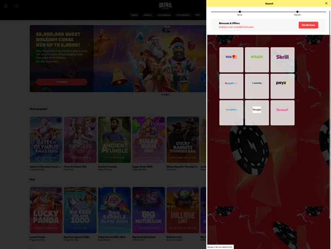 UltraCasino on innovatiivinen Pay N Play -kasinoplatformi, joka avaa ovet huippulaadukkaiden oikean rahan kasinopelien maailmaan – olipa kyseessä sitten monipuoliset kolikkopelit tai jännittävä live-kasino. Tämä antelias kasino hemmottelee pelaajiaan tervetulobonuksilla ja monipuolisilla kasinobonuksilla, ja lisäksi siellä odottaa oma houkutteleva VIP-ohjelma.